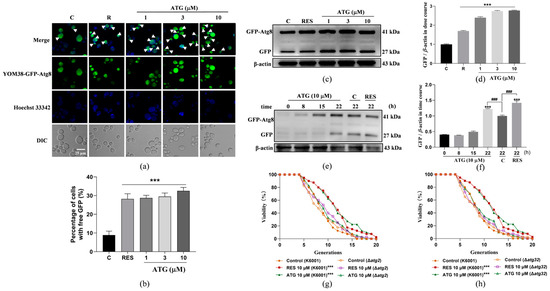 In brief, YOM38 yeast containing the pRS316-GFP-ATG8 plasmid was inoculated into YPD and incubated for 24 h with shaking in the dark. Then, the medium was replaced with SD medium. After mixing, 20 mL SD medium containing 300 µM RES or 1, 3, or 10 µM ATG were added with yeast with an initial OD600 value of 0.1, and the cells were cultured in the dark with shaking. After 22 h, SD medium was removed, and then Hoechst 33342 at a final concentration of 1 µg/mL was added for staining for 8 min under dark condition. Then, the Hoechst 33342 was removed from the background by washing three times with PBS. Finally, the cells were resuspended in 30% glycerol solution and autophagy-induced yeast were observed and imaged using a confocal fluorescence microscope (Olympus BX-51, Tokyo, Japan).