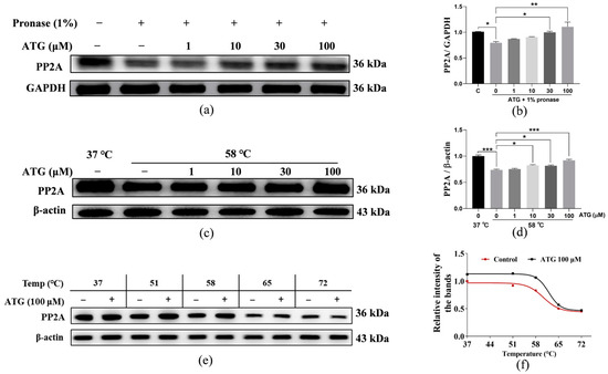 Identification of the target proteins of small molecule drugs is crucial to explore their mechanism of action. To identify potential target proteins of ATG, DARTS and CETSA techniques were used to test whether PP2A is the target of ATG. The DARTS technology is based on the fact that the binding of small molecules to target proteins increases the stability of proteins, thereby reducing proteins proteolysis [29], while CETSA technology is based on the principle that the binding of compounds to proteins affects the thermal stability of proteins [30]. The results of DARTS/Western bolt assay (Figure 5a,b and Supplementary Figure S5a, p < 0.05, p < 0.05,and p < 0.01) indicated that the stability of protein PP2A was improved by the addition of ATG. In addition, the CETSA/Western bolt results (Figure 5c–f, and Supplementary Figure S5b,c, p < 0.001, p < 0.05, p < 0.05,and p < 0.001) also showed that PP2A protein levels were significantly increased in the ATG-treated group compared with the control group. These results indicate that PP2A is a direct target protein of ATG.