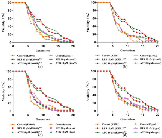 Effects of ATG on replicative lifespan of K6001 yeast mutants Δsod1 (a), Δsod2 (b), Δcat (c), and Δgpx (d). The average lifespan in K6001 were 7.03 ± 0.58 in negative control, 9.68 ± 0.75 in positive treatment group (p < 0.01), and 9.73 ± 0.80 in the group treated with 10 µM ATG (p < 0.01). (a) The average lifespan of Δsod1 mutant were 6.98 ± 0.48 in the negative group, 7.95 ± 0.61 in the positive group, and 7.70 ± 0.49 in the 10 µM ATG treatment group. (b) The average lifespan of Δsod2 mutant were 6.18 ± 0.39 in the negative group, 7.38 ± 0.64 in the positive group, and 6.78 ± 0.64 in the 10 µM ATG treatment group. (c) The average lifespan of Δcat mutant were 5.75 ± 0.43 in the negative group, 6.35 ± 0.40 in the positive group, and 6.58 ± 0.53 in the 10 µM ATG treatment group. (d) The average lifespan of Δgpx mutant were 6.78 ± 0.51 in the negative group, 7.58 ± 0.67 in the positive group, and 7.38 ± 0.66 in the 10 µM ATG treatment group. ** represent significant differences compared with the negative control group for p < 0.01.