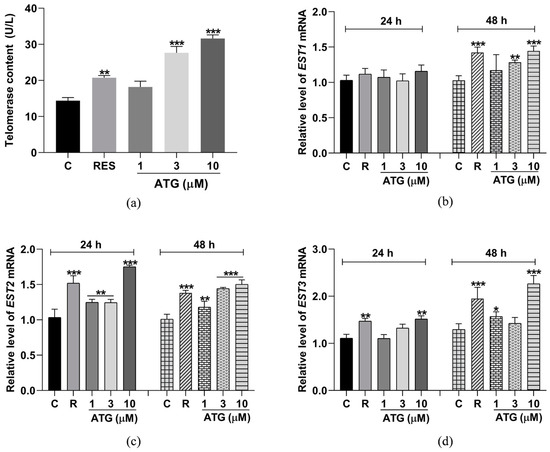 Telomerase activity is closely related to cellular senescence and age-related diseases [15]. Therefore, we assessed whether ATG was associated with yeast telomerase activity. The results showed that telomerase content was increased in yeast cells after 48 h treatment with ATG at concentrations of 3 µM and 10 µM (Figure 8a, p < 0.001, and p < 0.001). To explore whether the ATG-mediated telomerase activity is related to its effect on the expression of telomerase-related genes, we measured the transcript abundance of EST1, EST2, and EST3 in yeast after 24 or 48 h of treatment with different doses of ATG using qRT-PCR. The results showed that the mRNA levels of EST1 were significantly increased in cells treated with ATG for 48 h, but there was no significant difference in its content in yeast treated for 24 h (Figure 8b, p < 0.01, and p < 0.001). Meanwhile, the transcript levels of EST2 (Figure 8c, p < 0.01, p < 0.01, p < 0.01, p < 0.001, p < 0.01, p < 0.001, and p < 0.001), and EST3 (Figure 8d, p < 0.01, p < 0.05, and p < 0.001) were increased in cells treated with ATG for 24 h or 48 h, respectively. These results suggested that ATG may enhance telomerase content and activity in yeast by mediating the transcription of EST1, EST2, and EST3 genes, thereby extending lifespan.