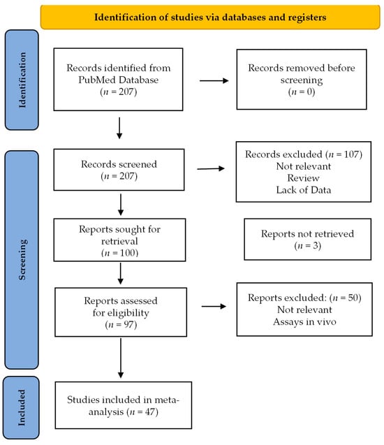 A comprehensive literature search was conducted in the PubMed database (https://pubmed.ncbi.nlm.nih.gov/) to retrieve all potential research articles exploring the antioxidant effects of stevia by means of in vitro assays. The search was lastly performed on 28 December 2023, using as the keywords “Stevia” and “antioxidant”, following the preferred reporting items for systematic reviews and meta-analyses (PRISMA) (http://www.prisma-statement.org/) [74], guidelines along with the advice for best practices [75]. To eliminate the implications of “gray literature bias”, articles in various languages were taken into consideration [76]. Eligible criteria for inclusion in the meta-analysis were: (a) assessment of the phenolic or flavonoid content of stevia leaf extracts, (b) (bio)chemical based in vitro antioxidant assays in stevia leaf extracts, (c) enzymatic-based assays that assess the antioxidant activity of fresh stevia leaves, and (d) antioxidant assays for stevia isolated glycosides. Articles with in vivo studies conducted on humans or animals, observational or intervention studies, and reviews were excluded. Studies that did not provide sufficient information or data necessary for the analysis were also excluded to ensure the reliability and validity of the results [77]. The systematic review and meta-analysis are registered in the OSF (Open Science Framework) (https://osf.io/) under the https://doi.org/10.17605/OSF.IO/5U7MQ.