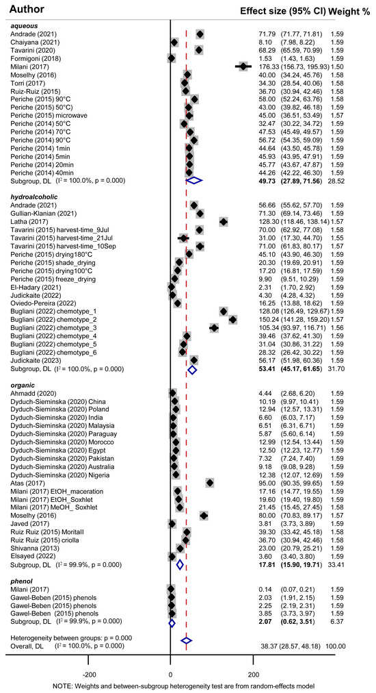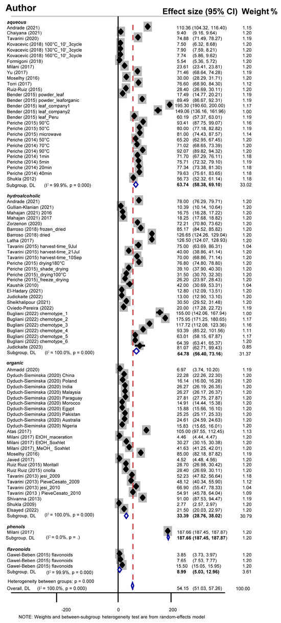Thus, our initial comprehensive meta-analysis encompassing data on all units (Figure 5) is valid, and hydroalcoholic extracts indeed show a higher TFC value of 53.41 mg of all equivalent compounds/g dry leaf sample compared to aqueous and organic extracts.