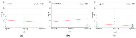 We next wondered whether variance in measuring units could affect the statistical synthesis of studies’ outcomes and confer between-study heterogeneity in the meta-analytical synthesis. To test this, a meta-regression analysis for TFC data across all measuring units was conducted separately for each type of extract. No statistically significant differences were found among various measuring units for any of the three types of extracts since p-values were 0.685 for aqueous, 0.439 for hydroalcoholic, and 0.059 for organic extracts (Figure 6). As a result, the TFC values of stevia leaf extracts are independent of these three measuring units and can be treated as coming from the same source, allowing their combination in subsequent meta-analyses.