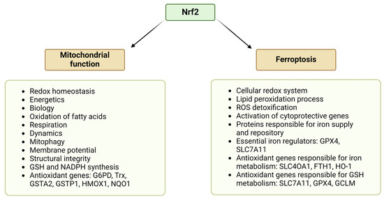 Many processes underlying the functions and activity of mitochondria are controlled by Nrf2 in different ways (Figure 1). It is well established that Nrf2-induced gene expression plays a fundamental role in mitochondrial processes governing their functional homeostasis and biology, energetics, fatty acid oxidation, or the production of adenosine triphosphate (ATP). This also affects respirational processes, as well as the dynamics of mitochondria [35]. Furthermore, it is known that Nrf2 encodes a battery of antioxidant genes (Glutamate–cysteine ligase catalytic subunit (GCLC), NAD(P)H dehydrogenase [quinone] 1 (NQO1), heme oxygenase 1 gene (HMOX1), Thioredoxin (Trx), Glucose-6-Phosphat-Dehydrogenase (G6PD), etc.) that orchestrate the mitochondrial metabolism of iron or the production of nicotinamide adenine dinucleotide phosphate (NADPH) as well as other homeostatic processes in this organelle [37] (Figure 1).