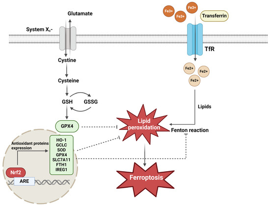 Dodson et al. discovered that Nrf2 has a crucial role in peroxidation of lipids and ferroptosis. This is evidenced by the fact that SLC7A11 and GPX4, essential regulators of ferroptosis, are controlled by Nrf2 [149]. Silencing of the Nrf2 regulator Keap1 contributed to iron induced decrease in expression of GPX4 and SLC7A11 as well as increase in expression of Acyl-CoA Synthetase Long Chain Family Member 4 (ACSL4) proteins, accentuating the significance of the role of Nrf2 in ferroptosis. Their data indicate that iron regulates gpx4 and slc7a11 by the Nrf2-ARE signaling pathway. Therefore, SLC7A11 and GPX4 are implicated in the Nrf2-mediated defense against iron dependent cell death by direct binding of Nrf2 to gpx4 and slc7a11 promoter regions inducing their transcription and thus controlling ferroptosis [151]. In a study on pancreatic cancer cells, Liu X et al. revealed that an increased expression of the NFE2L2 gene, encoding the Nrf2 protein, substantially reduces Fe2+ ion levels and lipid peroxidation, and leads to a decrease in GSH level after wogonin treatment. Conversely, the knockdown of NFE2L2 dramatically increased these processes upon wogonin treatment. These results confirmed that the level of Nrf2 expression correlates with the susceptibility of cells to ferroptosis; an elevation of Nrf2 expression suppresses this type of regulated cell death. This suppression is due to upregulated GSH levels by increasing the expression of GPX4 and SLC7A11 by Nrf2 [90].