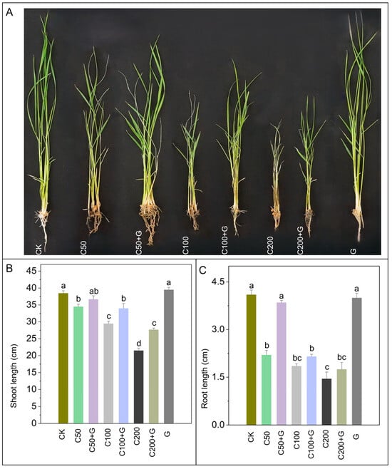 Evaluation of growth parameters in rice plants under normal conditions, copper stressed conditions and GABA supplemented copper stressed conditions. (A) shows effects of copper stress on overall plant growth, (B) shoot length, (C) shows root length. Whereas CK is control, C50 is 50 µM copper, C50+G is 50 µM copper and 1 mM GABA, C100 is 100 µM copper, C100+G is 100 µM copper and 1 mM GABA, C200 is 200 µM copper, C200+G is 200 µM copper and 1 mM GABA, and G is only 1 mM GABA treatment respectively. Each column represents the means of three replicates ±SE. Distinct lower case letters indicate statistically significant differences within each treatment group, as determined by Duncan’s multiple range test at a significance level of p ≤ 0.05.