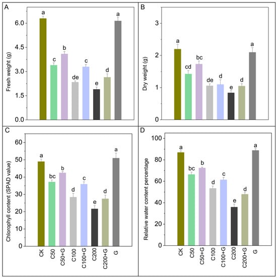 Effects of GABA on (A) fresh weight, (B) dry weight, (C) chlorophyll content, and (D) relative water content of rice plants under copper stress. Whereas CK is control, C50 is 50 µM copper, C50+G is 50 µM copper and 1 mM GABA, C100 is 100 µM copper, C100+G is 100 µM copper and 1 mM GABA, C200 is 200 µM copper, C200+G is 200 µM copper and 1 mM GABA, and G is only 1 mM GABA treatment respectively. Each column represents the means of three replicates ±SE. Distinct lower case letters indicate statistically significant differences within each treatment group, as determined by Duncan’s multiple range test at a significance level of p ≤ 0.05.