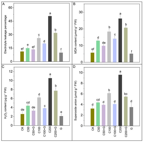 Effects of GABA on electrolyte leakage and reactive oxygen species of rice plants under copper stress. Where, (A) is electrolyte leakage, (B) is MDA content, (C) is H2O2 content, and (D) is superoxide anion. Whereas CK is control, C50 is 50 µM copper, C50+G is 50 µM copper and 1 mM GABA, C100 is 100 µM copper, C100+G is 100 µM copper and 1 mM GABA, C200 is 200 µM copper, C200+G is 200 µM copper and 1 mM GABA, and G is only 1 mM GABA treatment respectively. Each data bar represents means of three replicates ±SE. Distinct lower case letters indicate statistically significant differences within each treatment group, as determined by Duncan’s multiple range test at a significance level of p ≤ 0.05.