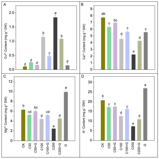 Effects of GABA on (A) copper, (B) calcium, (C) magnesium, and (D) potassium content accumulation in rice plants under copper stress. Whereas CK is control, C50 is 50 µM copper, C50+G is 50 µM copper and 1 mM GABA, C100 is 100 µM copper, C100+G is 100 µM copper and 1 mM GABA, C200 is 200 µM copper, C200+G is 200 µM copper and 1 mM GABA, and G is only 1 mM GABA treatment respectively. Each column represents the means of three replicates ±SE. Distinct lower case letters indicate statistically significant differences within each treatment group, as determined by Duncan’s multiple range test at a significance level of p ≤ 0.05.