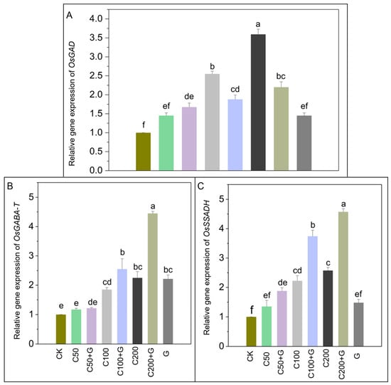 Effects of GABA on relative gene expression of (A) OsGAD, (B) OsGABA-T, and (C) OsSSADH in rice plants under copper stress. Actin was used as the reference gene. Whereas CK is control, C50 is 50 µM copper, C50+G is 50 µM copper and 1 mM GABA, C100 is 100 µM copper, C100+G is 100 µM copper and 1 mM GABA, C200 is 200 µM copper, C200+G is 200 µM copper and 1 mM GABA, and G is only 1 mM GABA treatment respectively. Each column represents the means of three replicates ± SE. Distinct lower case letters indicate statistically significant differences within each treatment group, as determined by Duncan’s multiple range test at a significance level of p ≤ 0.05.