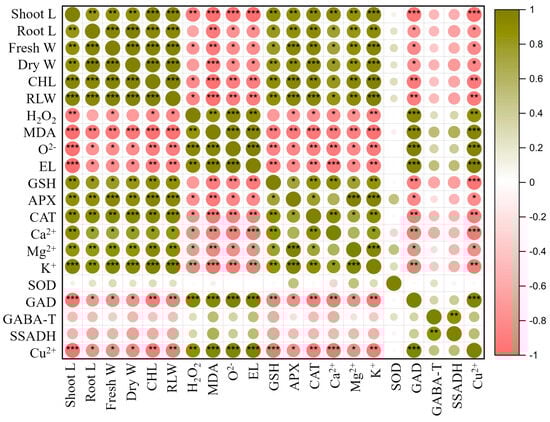 Pearson’s correlation matrix between rice growth attributes, reactive oxygen species, anti-oxidant enzymes, and gene expression in copper-stressed plants. Correlations are displayed in green (positive) and red (negative); color intensity and circle size are proportional to the correlation coefficient. * indicates p < 0.05, ** indicates p < 0.01, and *** indicates p < 0.001.