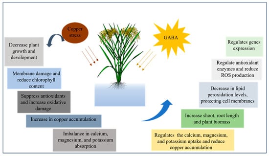 The study highlights copper stress’s adverse effects on rice plants, impacting growth and increasing oxidative damage (Figure 8). However, GABA application effectively countered copper-induced stress. GABA supplementation reversed growth reduction, improved chlorophyll levels, and reduced ROS accumulation, reducing copper absorption and enhancing mineral uptake. GABA’s ability to strengthen antioxidant enzymes and regulate gene expression, especially in the GABA shunt pathway, played a crucial role in mitigating copper stress. Overall, GABA emerges as a promising solution, enhancing plant resilience and defending against oxidative damage during copper stress in rice plants. Utilizing GABA as a protective agent holds significant promise for transforming agricultural practices, providing a sustainable remedy to enhance plant resilience against environmental stressors. Further exploration and field experiments will be crucial in fully comprehending GABA’s broader applications and optimizing its utilization in shielding crops from oxidative damage due to copper stress.