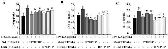 Effects of L. fermentum 664 or LGG treatments on the expression of immune indicators interleukin-6 (IL-6) (A), tumor necrosis factor-α (TNF-α) (B), and interleukin-1β (IL-1β) (C). All data are expressed as the mean ± SD (n = 3). Superscripts (a–e) are substantially different from one another (p < 0.05).