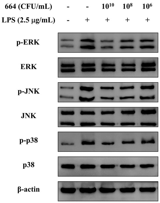 Effects of different concentrations of L. fermentum 664 on mitogen-activated protein kinases (MAPKs) expression in the cell model.