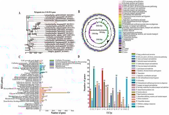 Analysis of the genome properties of L. fermentum 664. (A) The phylogenetic tree. (B) Genome circle. From the outside to the center: Clusters of Orthologous Groups (COG) annotation for coding deoxyribonucleic acid sequences (CDS) (colored according to COG categories) in the forward strand, CDS, transfer RNA (tRNA), and ribosomal DNA (rRNA) in the forward strand, COG annotation for CDS in the reverse strand, CDS, tRNA, and rRNA in the reverse strand, GC content (higher-than-average GC content: outward portion, lower-than-average GC content: inward portion), GC-Skew value (higher-than-average values: green, lower-than-average values: purple), and genome size. (C) The pathways of functional annotations for Kyoto Encyclopedia of Genes and Genomes (KEGG). The ordinate represents the Level 2 hierarchy of the KEGG pathway and the different column colors represent the Level 1 classification of the KEGG pathway. (D) The COG function annotation.