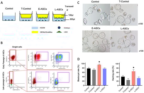 (A) Scheme of in vitro culture of embryos using a Transwell. Control: embryos incubated KSOM without Transwell; T-Control: no cells in the upper chamber; E-ASCs (adipose tissue-derived mesenchymal stem cells): early passage of ASCs (P3: 3rd passage) seeded in the upper chamber; L-ASCs: late passage of ASCs (P20: 20th passage) seeded in the upper chamber. (B) Multicolor flow cytometry analysis of cells in the plot of singlet cells based on staining for CD105, CD29, Sca-1, and CD45. The percentages of mesenchymal stem cells, including early passage (3rd passage) adipose tissue-derived stem cells (ASCs) and late passage (20th passage) ASCs, harboring the cell-surface expression markers CD29, Sca-1, and CD105, and negative CD45 are shown. Cells in pink box indicate mesenchymal stem cells. (C) Embryo morphology on Day 4. (D) Blastocyst and hatching rates of in vitro-produced mouse embryos co-cultured with ASCs. The mean percentage was calculated from three independent experiments. n = 150 per group. Data are presented as the mean ± standard error. * p < 0.05 vs. Control.