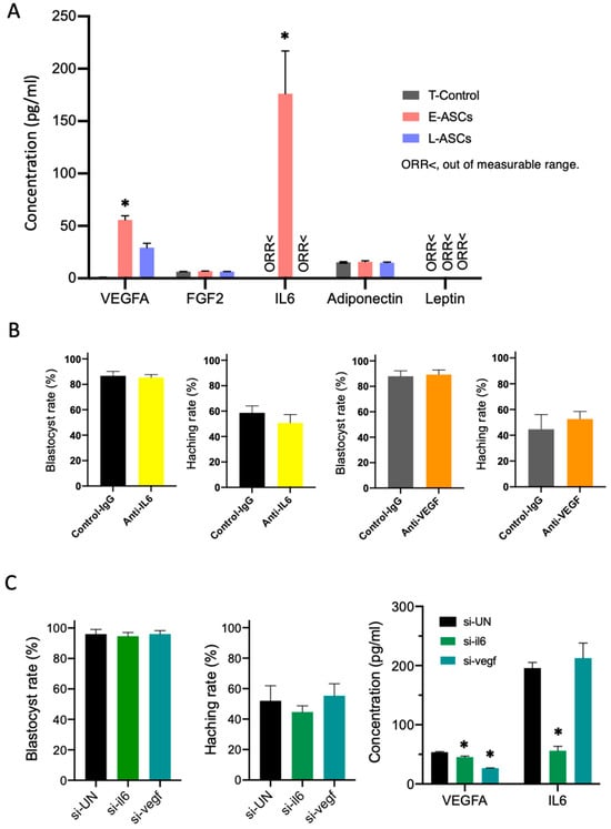 (A) Factor composition of the lower chamber. T-Control: no cells in the upper chamber; E- ASCs (adipose tissue-derived mesenchymal stem cells): the early passage of ASCs (P3: 3rd passage) seeded in the upper chamber; L-ASCs: the late passage of ASCs (P20: 20th passage) seeded in the upper chamber. Data are presented as the mean ± standard error. * p < 0.05 vs. T-Control. <ORR: out of measurable range. (B) Blastocyst and hatching rates for in vitro culture of embryos with mouse VEGF antibody or mouse IL-6 antibody. (C) Blastocyst rates, hatching rates, and concentration of VEGFA and IL-6 for in vitro culture of embryos with E-ASCs transfected with short interfering RNA (siRNA). Data are presented as the mean ± standard error. * p < 0.05 vs. Control. UN: Universal control.