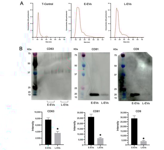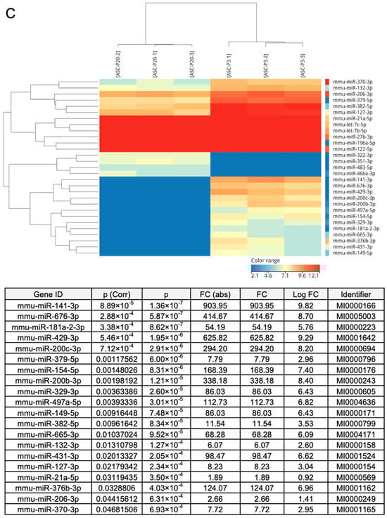 EVs, including exosomes, shedding vesicles, prostasomes, and apoptotic bodies, are membrane vesicles of 40–1000 nm that are released from many cell types, including red blood cells, platelets, lymphocytes, dendritic cells, endothelial cells, and tumor cells []. In particular, CD9, CD63, and CD81 are recognized as exosome-specific markers []. In this study, the size of the nanoparticles ranged between 50 and 600 nm, and most of them were between 100 and 200 nm in all media groups. The numbers of nanoparticles were 8.2 × 108 ± 3.51 × 107/mL in the T-Control group, 2.74 × 109 ± 1.90 × 108/mL in the E-ASC group, and 1.98 × 109 ± 2.75 × 108/mL in the L-ASC group (Figure 3A). These nanoparticles expressed CD63, CD81, and CD9, as determined by Western blotting, and were presumed to be exosomes (Figure 3B). From the difference in the number of nanoparticles, the numbers of exosomes in E-ASCs (E-EVs) and L-ASCs (L-EVs) were estimated at approximately 1.92 × 109/mL and 1.16 × 109/mL, respectively. Expression analysis of microRNAs in EVs derived from E-ASCs and L-ASCs utilizing a next-generation sequencing technique unveiled an upregulation of miR-141-3p, miR-676-3p, miR-181a-2-3p, miR-429-3p, miR-200c-3p, miR-379-5p, miR-154-5p, miR-200b-3p, miR-329-3p, miR-497a-5p, miR-149-5p, miR-382-5p, miR-665-3p, miR-132-3p, miR-431-3p, miR-127-3p, miR-21a-5p, miR-376b-3p, miR-206-3p, and miR-370-3p (Figure 3C). These findings suggest that while both E-ASCs and L-ASCs release EVs, E-ASCs demonstrate a greater abundance and a distinct repertoire of miRNAs.