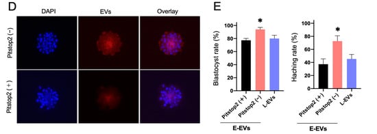 The E-ASC-EVs fluorescently labeled red by the ExoGlow-Membrane EV Labeling Kit were observed to be integrated into the inner blastocyst, as verified through fluorescence microscopy. On the other hand, the inhibition of E-ASC-EV uptake by pitstop2 was similarly confirmed by fluorescence microscopy (Figure 3D). The blastocyst development and hatching rates when incubated in KSOM mixed with E-ASCs-EVs (94.0 ± 4.3% and 72.7 ± 11.6%, respectively) were higher than those of blastocysts with inhibited E-ASCs-EVs uptake by pitstop2 (77.3 ± 4.1% and 37.3 ± 11.6%, respectively) (Figure 3E). However, L-ASC-EVs did not improve the blastocyst formation rate (Figure 3E).