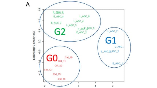 We conducted a transcriptome analysis of the blastocysts grown from the 2-cell embryos in the KSOM (control [Ctrl] N = 8), the KSOM supplemented with E-ASCs-EVs (N = 8), and the KSOM supplemented with L-ASCs-EVs (N = 8). Based on our initial evaluation of the transcriptome data of 24 blastocysts by hierarchical clustering and multidimensional scaling (MDS) using EdgeR, we excluded two samples (Ctrl_14 and Ctrl_16) from the control group and one sample (E_ASC_7) as an outlier. The count data of the 21 samples were analyzed using the EdgeR 3.36.0. After excluding genes that were not expressed in any of the three sample groups, the count data for 13,292 genes was subjected to TMM normalization. The MDS analysis of the normalized data separated the 21 samples into three clusters: (Group 0 [G0], Group 1 [G1], and Group 2 [G2]) (Figure 4A). All six Ctrl samples were clustered together as Group0. Additionally, E_ASC and L_ASC samples were clustered into either Group 1 or Group 2. Group 1 contained one E_ASC and four L_ASC samples, whereas Group 2 contained six E_ASC and four L_ASC samples. Upon comparing Group 1 and Group 0, we identified 1318 up-regulated genes in Group 1. Those up-regulated genes in Group 1 were enriched with GO terms, such as “Nonsense Mediated Decay independent of the Exon Junction Complex”, “Ribonucleoprotein complex biogenesis”, “Detoxification of Reactive Oxygen Species”, and “Mechanisms associated with pluripotency” (Figure 4B). When comparing Group 2 and Group 0, we identified 1965 up-regulated genes in Group 2. In a gene ontology (GO) analysis using Metascape, the up-regulated genes in Group 2 were found to be enriched with GO terms such as “Nonsense Mediated Decay independent of the Exon junction Complex”, “Detoxification of Reactive Oxygen Species”, “Mechanisms associated with pluripotency”, and “In utero embryonic development.” (Figure 4B). In the comparison of Group 2 and Group 1, we identified 1385 up-regulated genes in Group 2. Those up-regulated genes in Group 2 were enriched with GO terms such as ”Actin cytoskeleton organization”, “Embryonic organ development”, “Embryonic placenta development”, and “Mechanisms associated with pluripotency” (Figure 4B). EVs derived from the mesenchymal stem cells may induce the development of blastocyst, accompanied by a high expression of genes involved in the cell cytoskeleton, pluripotency, and detoxication of reactive oxidative stress, and EVs derived from mesenchymal stem cells with distinct stemness may also generate the development of blastocysts as well as blastocyst outgrowth (Figure 4C).
