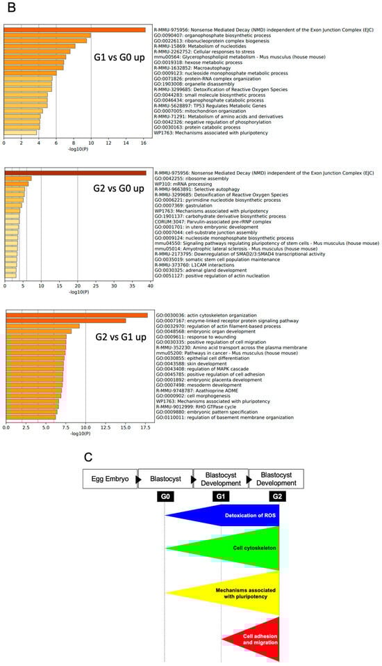 Effects of exosomes on the gene expression of blastocysts cultured in vitro. (A) Identification of three clusters based on transcriptome data. (B) Characterization of up-regulated genes affected by E-EVs and L-EVs. (C) Summary of the GO analysis among the three groups, G0, G1, and G2: the genes associated with the cell cytoskeleton, pluripotency, and detoxification of reactive oxidative stress were remarkably up-regulated in G2, compared with those in G0 and G1, and in G1, they also significantly increased, compared with those in G0. In addition, the genes associated with cell adhesin and migration in G2 indicated high expression compared with those in G1.