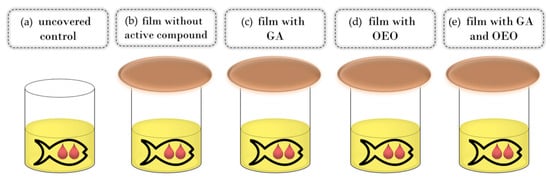 Schema of the experimental setup: control (a), CSGEL film without active compounds (b) and CSGEL films enriched with GA (c), OEOs (d), and both (e). CSGEL—chitosan/gelatin; GA—gallic acid; OEO—orange essential oil.