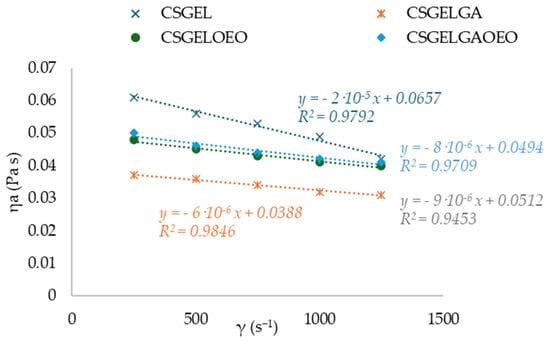 Curves of apparent viscosity ηa (Pa s) vs. shear rate γ (s−1) for various CSGEL solutions. CSGEL—chitosan/gelatin; GA—gallic acid; OEO—orange essential oil.