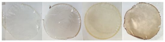 Picture of produced films (from left to right, CSGEL, CSGELGA, CSGELOEO, CSGELGAOEO). CSGEL—chitosan/gelatin; GA—gallic acid; OEO—orange essential oil.