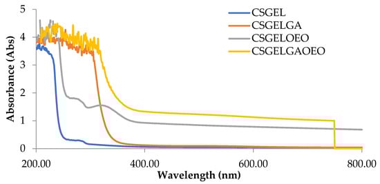 The absorption spectra of all film formulations, in the UV and visible range of the spectrum, are given in Figure 4. It is generally recognized that gelatin-based films are effective ultraviolet barriers because they contain high amounts of amino acids with aromatic groups in the side chains that absorb UV radiation at wavelengths of up to 280 nm [66]. The addition of gallic acid reduced the transmittance in the whole UV spectra, with significant differences for CSGELGA up to 300 nm (for 400%) and even up to 320 nm for CSGELGA OEO (for 500%). With the addition of the orange essential oils (CSGELOEO), the absorbance was significantly reduced up to 370 nm when compared to the control CSGEL film. The observed results follow trends given in the scientific literature for films cross-linked with anillin [67], betel (Piper betle L.) leaf ethanolic extracts [58], and green tea carbon dot [68], indicating a good UV protection of produced formulations, which could very likely be used in the future to reduce oxidation changes and extend the shelf-life of the product.