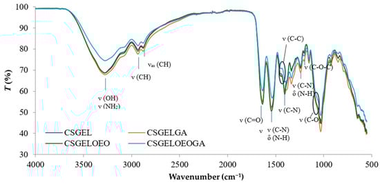FTIR spectra of various chitosan and gelatin film formulations. CSGEL—chitosan/gelatin; GA—gallic acid; OEO—orange essential oil.