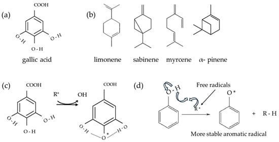 Schema of (a) gallic acid; (b) principal orange essential oil compounds; (c) possible stabilization of gallic acid; and (d) schema of a possible stabilization of aromatic ring—oxidation of antioxidants. Schemas adapted from [78,79,80,81].