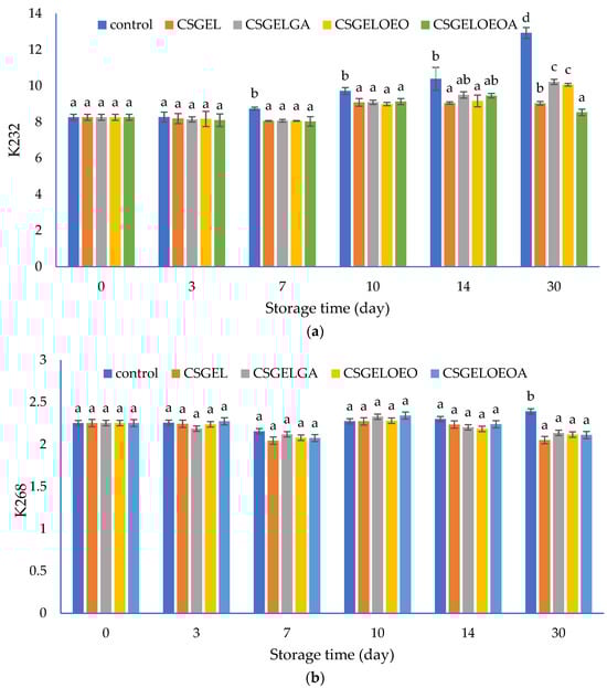 The evolution of (a) conjugated dienes (K232) and (b) conjugated trienes (K268) values in different oil samples covered with various films during 30 days of storage at 20 ± 2 °C. CSGEL—chitosan/gelatin; GA—gallic acid; OEO—orange essential oil. Different exponents (a–d) indicate significant differences among samples on each sampling day (p < 0.05).