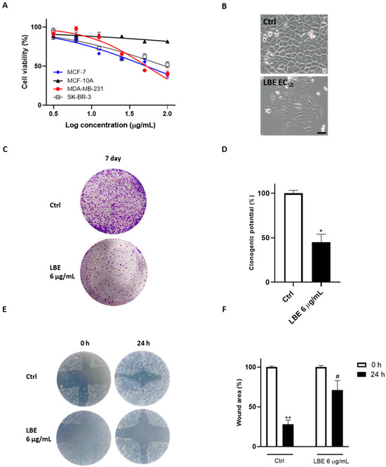 Figure 1. Cytotoxic effects of LBE on MCF-7 breast cancer cell line. Inhibitory action on cell proliferation of LBE was initially measured through MTT assay after 24 h of treatment of MCF-7, MDA-MB-231, and SK-BR-3 cell lines and MCF-10A healthy epithelial cell line (A). Then, EC50s were estimated. EC50 values are expressed as mean ± SD. (B) After 24 h of LBE exposure (EC50), morphological changes were observed using phase-contrast microscope, revealing pyroptotic features of MCF-7 cells treated with LBE. Magnification 40×. Scale bar: 50 μm. (C) Representative images of clonogenic assay in presence of LBE (6 μg/mL) for 7 days. (D) Histogram referring to optical density (OD) obtained from 1% SDS cell dissolution and measured by using spectrophotometer. (E) Effect of LBE exposure (6 μg/mL) on cell migration of MCF-7 cells through wound healing assay by using phase-contrast microscope. Magnification 20×. (F) Quantitative analysis of wound area of MCF-7 cells at time 0 and 24 h. Data are shown as mean ± SD of three different experiments performed in triplicate. * p < 0.05 vs. Ctrl; ** p < 0.01 vs. Ctrl; # p < 0.05 vs. Ctrl after 24 h.