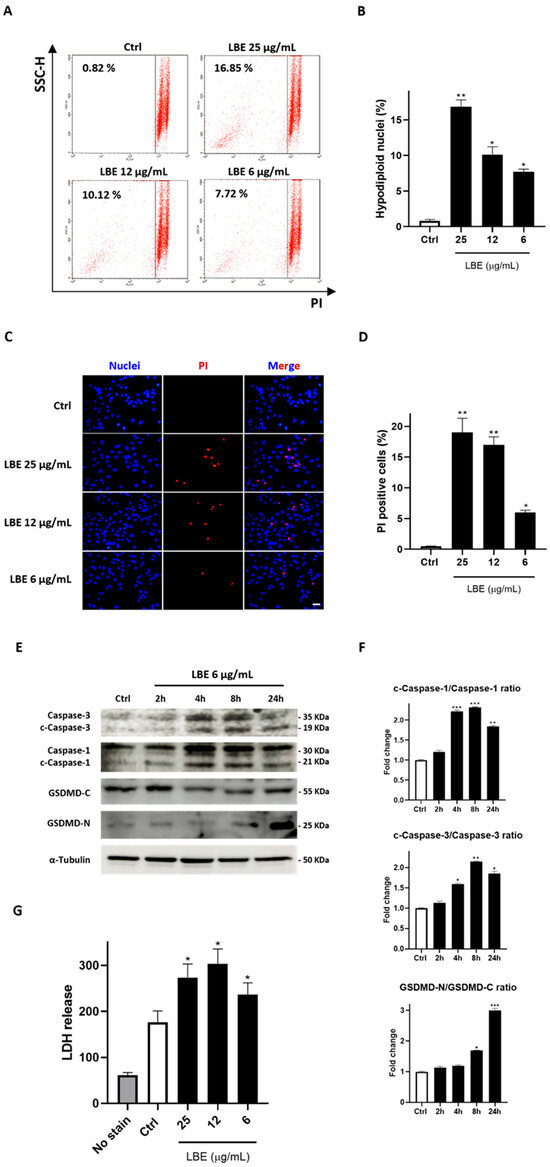 Figure 2. LBE selectively induces pyroptosis of MCF-7 breast cancer cell line. (A) After 24 h of LBE exposure (25, 12, 6 μg/mL), MCF-7 cells were stained with propidium iodide and fluorescence of hypodiploid nuclei (sub G0/G1) was measured by flow cytometry. (B) Quantitative analysis of hypodiploid nuclei was performed. (C) Hoechst 33342/PI double staining was performed to analyze dead and living cell distributions after exposure to LBE (25, 12, 6 μg/mL). (D) Quantitative analysis of PI-positive cells was performed (N ≥ 10). Scale bar: 20 μm. Cells were observed at 20× magnification. (E) Western blots of pyroptosis markers after exposure to LBE (6 μg/mL) at 2, 4, 8, and 24 h. (F) Densitometric analysis of Western blots. (G) LDH levels after exposure to LBE (25, 12, 6 μg/mL) at 24 h revealed by luminescence assay. Data are shown as mean ± SD of three different experiments performed in triplicate. * p < 0.05 vs. Ctrl; ** p < 0.01 vs. Ctrl; *** p < 0.001 vs. Ctrl.