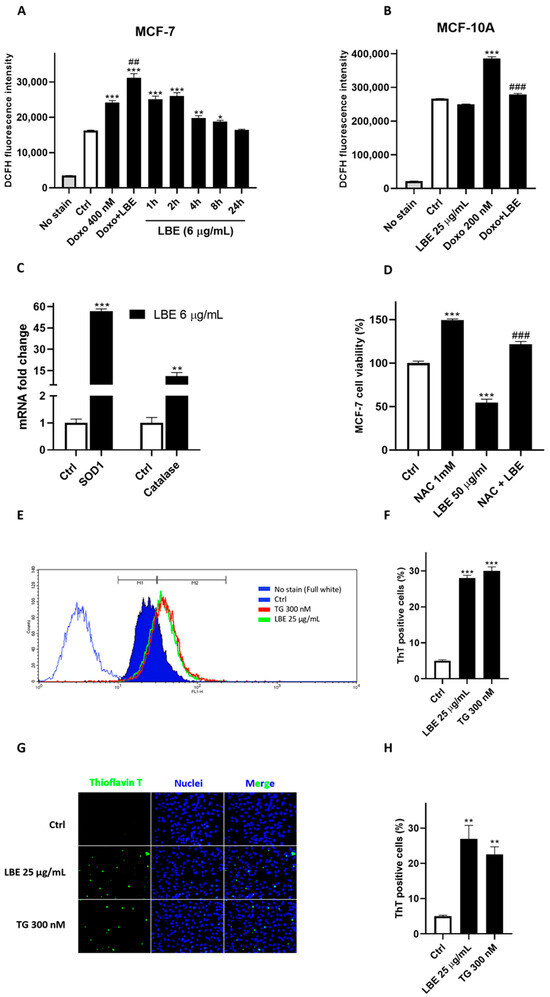 Figure 3. LBE selectively triggers oxidative stress in MCF-7 breast cancer cell line while protecting MCF-10A cell line from doxorubicin-induced ROS. 2′,7′-dichlorofluorescin diacetate (DCFH-DA) assay was conducted on MCF-7 (A) and MCF-10A cells (B) to reveal ROS production. Doxorubicin was used as positive control (400 and 200 nM for 4 h). Co-administration was assessed at 4 h. (C) Total RNA samples extracted from MCF-7 cells exposed for 24 h to LBE (6 μg/mL) were analyzed by q-PCR to detect CAT and SOD1 mRNA levels. GAPDH was used as housekeeping control. 2−∆∆CT method was employed to calculate relative quantities of mRNA. Results are expressed as fold change relative to untreated cells. (D) MCF-7 cell viability using NAC as antioxidant corroborates pro-oxidant mechanism of LBE. ThT assay was performed for both flow cytometry (E) and fluorescence microscopy (G). Scale bar: 20 μm. (N ≥ 10). Cells were observed at 20× magnification. Thapsigargin 300 nM was used as positive control. (F,H) Quantitative analysis of ThT-positive cells was reported. Data are shown as mean ± SD of three different experiments performed in triplicate. * p < 0.05 vs. Ctrl; ** p < 0.01 vs. Ctrl; *** p < 0.001 vs. Ctrl. ## p < 0.01 vs. doxorubicin; ### p < 0.001 vs. doxorubicin.