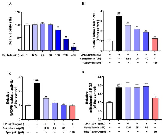 Anti-oxidative activity of scutellarein in LPS-activated BEAS-2B cells (n = 3). (A) Effect of scutellarein on the viability of BEAS-2B cells. (B–D) Effects of scutellarein on the intracellular ROS levels (B), NADPH oxidative activity (C), and mitochondrial ROS (D) levels in LPS-activated BEAS-2B cells. Apocynin and Mito-TEMPO served as the positive controls. ## p < 0.01 vs. negative control; ** p < 0.01 vs. LPS alone.