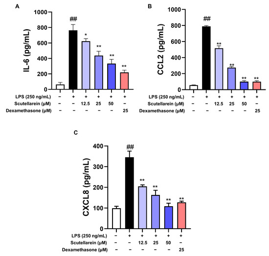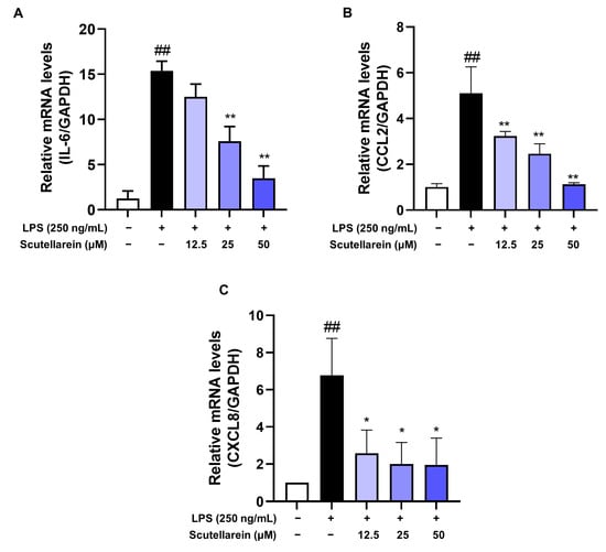 Effects of scutellarein on the mRNA levels of IL-6 (A), CCL2 (B), and CXCL8 (C) (n = 3). ## p < 0.01 vs. negative control; * p < 0.05 and ** p < 0.01 vs. LPS alone.