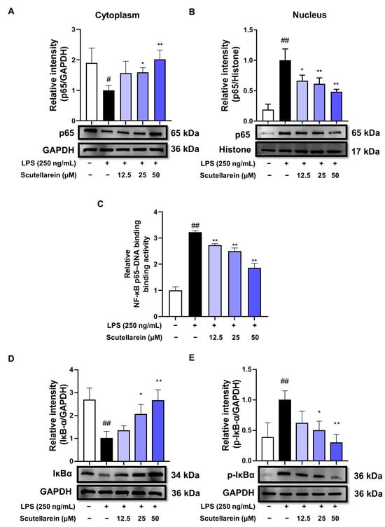 Effect of scutellarein on NF-κB signaling in LPS-activated BEAS-2B cells (n = 3). (A,B) Effect of scutellarein on LPS-induced p65 nuclear translocation. # p < 0.05 and ## p < 0.01 vs. negative control; * p < 0.05 and ** p < 0.01 vs. LPS alone. (C) Effect of scutellarein on LPS-induced p65–DNA binding. ## p < 0.01 vs. negative control; ** p < 0.01 vs. LPS alone. (D,E) Effects of scutellarein on LPS-induced IκBα degradation and phosphorylation. ## p < 0.01 vs. negative control; * p < 0.05 and ** p < 0.01 vs. LPS alone.