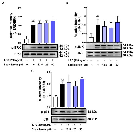 Effect of scutellarein on AP-1 signaling in LPS-activated BEAS-2B cells (n = 3). (A–C) Effects of scutellarein on the LPS-induced phosphorylation of MAPK family members [ERK (A), JNK (B), and p38 (C)]. ## p < 0.01 vs. negative control.