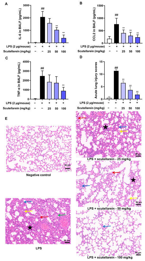 Effects of scutellarein on LPS-induced ALI mice. ALI was induced via the intratracheal delivery of LPS (2 μg/20 μL/mouse) using a mouse microsprayer aerosolizer. (A–C) Effects of scutellarein on the levels of IL-6 (A), CCL2 (B), and TNF-α (C) in BALF (n = 8). (D) Lung injury scores were calculated according to the predetermined criteria. ## p < 0.01 vs. negative control; ** p < 0.01 vs. LPS alone. (E) Representative images of H and E staining in lung tissues (200×). The green arrows in the figure point to the edema condition. The blue arrows point to alveolar and interstitial inflammation. The red arrows point to alveolar and interstitial hemorrhage. The yellow arrows point to hyaline membrane formation. The black pentagrams point to atelectasis. Scale bars, 50 µm.