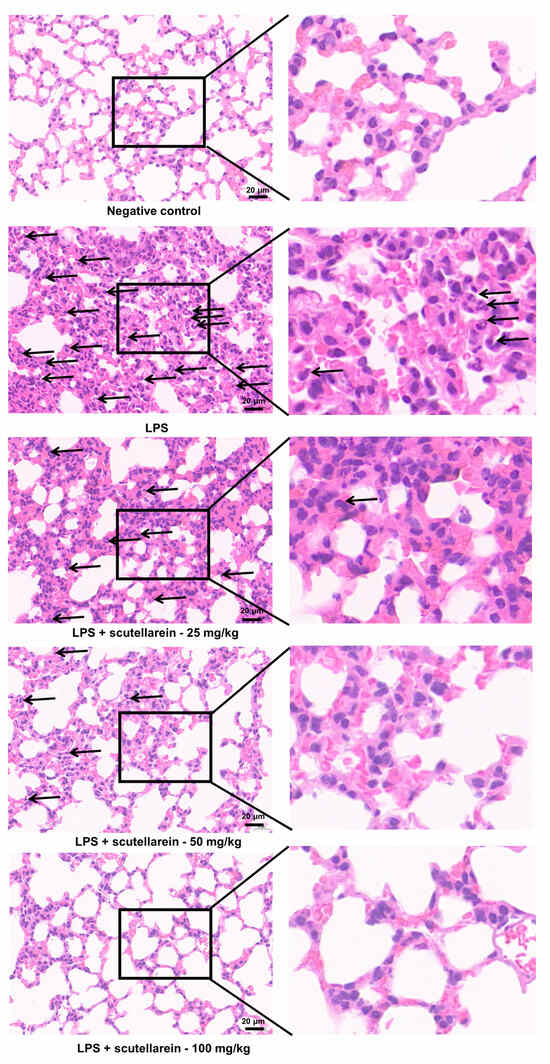 Effect of scutellarein on neutrophilic infiltration in LPS-induced ALI mice. Representative images of H and E staining in lung tissues (400×). The black arrows point to neutrophils. Scale bars, 20 µm.