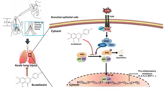 Schematic diagram illustrating the anti-inflammatory effects of scutellarein in the LPS-activated bronchial epithelial cells of acute lung injury mice. Black arrow means positive regulation. Red “T” means inhibition.