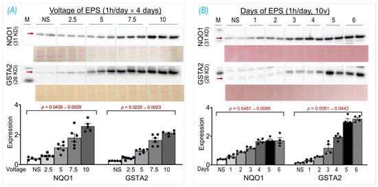 NQO1 and GSTA2 protein expression in C2C12 myotubes receiving EPS at different voltages (A) and durations (B). Red arrows indicate the target bands. Data are expressed as mean ± SD; n = 4–6/each group. NS, non-stimulated control. The y-axes of the bar graphs indicate protein expression normalized by Ponceau S.