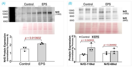 Protein expression of Nrf2 in the C2C12 myotubes receiving EPS, detected by using two different antibodies: (A) A0674 (ABclonal) and (B) 16396-1-AP (Proteintech). Data are expressed as mean ± SD; n = 3/each group.