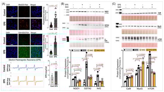 To investigate the role of ROS in the EPS-evoked activation of Nrf2/antioxidant systems, we employed three techniques to measure the ROS levels and used a ROS scavenger, N-acetylcysteine (NAC). As can be seen in the MitoSOX-Red, CM-H2DCFDA, and EPR spectroscopy data shown in Panel A of Figure 4, the EPS cells exhibited a significantly higher fluorescence intensity and EPR spectrum amplitude compared to the control cells. These data indicate a significantly high ROS level in the mitochondria, cytosol, and whole cells of the C2C12 myotubes that received stimulation and demonstrated an increased ROS generation from the mitochondria of the contracting muscle. Panel B of Figure 4 shows that the EPS-induced upregulation of Nrf2/antioxidant enzymes was completely abolished by the NAC pretreatment (EPS + NAC), suggesting that the increased ROS is the exclusive mediator of the Nrf2/antioxidant upregulation induced by EPS. Interestingly, we found that the NQO1 expression was significantly lower in the cells treated with NAC alone compared to the cells without any treatment, suggesting that the basal expression of this antioxidant enzyme relies on the physiological levels of ROS. Panel C of Figure 4 shows the expression of three non-antioxidant proteins, where NAC had no effects on the EPS-induced upregulation of CaM and MyoG but did abolish the mTOR response.