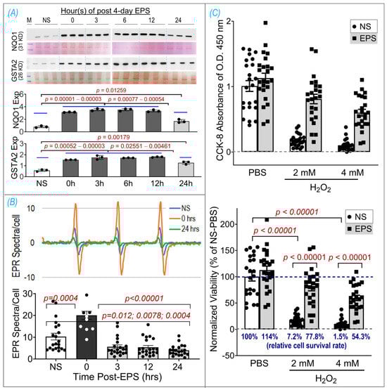 To determine how long antioxidant proteins can remain upregulated after stopping stimulation, we carried out an experiment to evaluate the time course of NQO1 and GSTA2 protein expression in the samples harvested at 0, 3, 6, 12, and 24 h after EPS (Panel A of Figure 6). We did not find a significant difference in protein expression between the samples at 0, 3, 6, and 12 h. However, protein expression in the 24 h sample was significantly lower than that in other EPS samples but still significantly higher than that in the non-stimulated control sample. These data suggest that EPS-enhanced antioxidant enzyme expression can last at least 24 h. On the other hand, the EPR spectroscopy showed a significant increase in ROS immediately after EPS (i.e., 0 h), which rapidly declined in the 3–24 h samples to levels below that in the non-EPS sample (Panel B, Figure 6). These data suggest that the upregulated endogenous antioxidants by EPS provide C2C12 myotubes with excess antioxidant capacity, a status we term “antioxidant preconditioning”, which can protect the cells against subsequent oxidative stressor-induced injury. As can be seen in Panel C of Figure 6, the survival rates of the EPS cells exposed to 2 mM and 4 mM H2O2 were 77.8% and 54.3% of the PBS-NS control group, about 11- and 36-fold higher than that of the H2O2-NS cells, whose survival rates were 7.2% and 1.5%, respectively.
