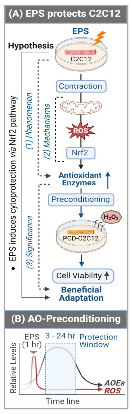 By employing C2C12 myotubes, we demonstrated that consecutive multiple sets of EPS over 4 days profoundly elevated the protein expression of a group of antioxidant enzymes when the interval of any two chronologically adjacent stimulations was less than 24 h. The translation of this in vitro experimental data into a strategy to optimize long-term exercise thus points to the significance of intervals between two sets of exercise-induced muscle antioxidant adaptation. This study provides evidence to demonstrate that short-term contraction can protect skeletal myocytes against subsequent oxidative stress-induced cytotoxicity, likely via ROS-dependent Nrf2-evoked activation of intracellular antioxidant mechanisms (Panel A, Figure 7), which provides a novel insight into the area of SkM redox signaling responses to exercise [].