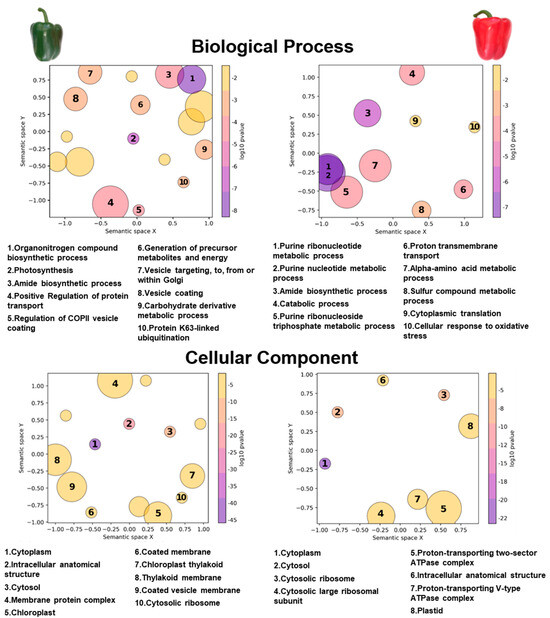 Gene ontology (GO) functional classification obtained for persulfidated proteins of pepper fruits. The scatterplots show GO terms as circles arranged such that those that are most similar in semantic space X and Y are placed nearest to each other. In this case, those proteins that appear exclusively at each stage of ripening have been analyzed, either green fruits (left panels) or red fruits (right panels), and the most enriched terms are shown. The number that appears inside each circle indicates which category proteins belong to. The size of the circles is directly proportional to the number of proteins in each sub-category that fall under each main category according to our data. The distance between the circles indicates a direct relationship between the categories. The p-value indicates the statistical significance of the GO category enrichment in our results.