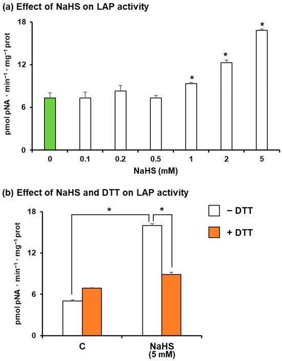 (a) Effect of NaHS on the LAP activity of sweet pepper fruits where the samples were pre-treated in the absence or presence of 0.1–5.0 mM NaHS for 1 h at 25 °C (white bars). The green bar corresponds to the control sample not treated with NaHS (b) Effect of 5 mM NaHS on LAP activity in the presence and absence of dithiothreitol (DTT). Green pepper extracts were pre-treated in the absence or presence of 5 mM NaHS for 1 h at 25 °C (white bars), and then further incubation with 5 mM DTT was performed for 30 min (brown bars). Data are shown as the means ± SEM. Asterisks indicate that differences in relation to corresponding control values were statistically significant at p < 0.05.