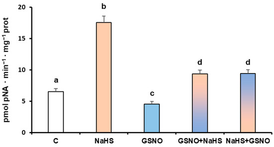 Effect of NaHS and S-nitrosoglutathione (GSNO) on the LAP activity of sweet pepper fruit. Green pepper extracts were only treated with either 5 mM NaHS or 5 mM GSNO for 1 h at 25 °C. Additionally, samples were treated with the two compounds: first adding GSNO for 30 min at 25 °C and further incubating with NaHS for another 30 min at the same temperature (column GSNO + NaHS), and vice versa (column NaHS + GSNO). The white bar corresponds to the control sample without any treatment. The light brown bar corresponds to the treatment with NaHS. The blue bar corresponds to the GSNO treatment. The bars with both colors correspond to a combined and sequenced treatment, with the lower color, either blue (GSNO) or light brown, being applied first. Data are shown as the means ± SEM. Different letters indicate significant differences (p < 0.05).